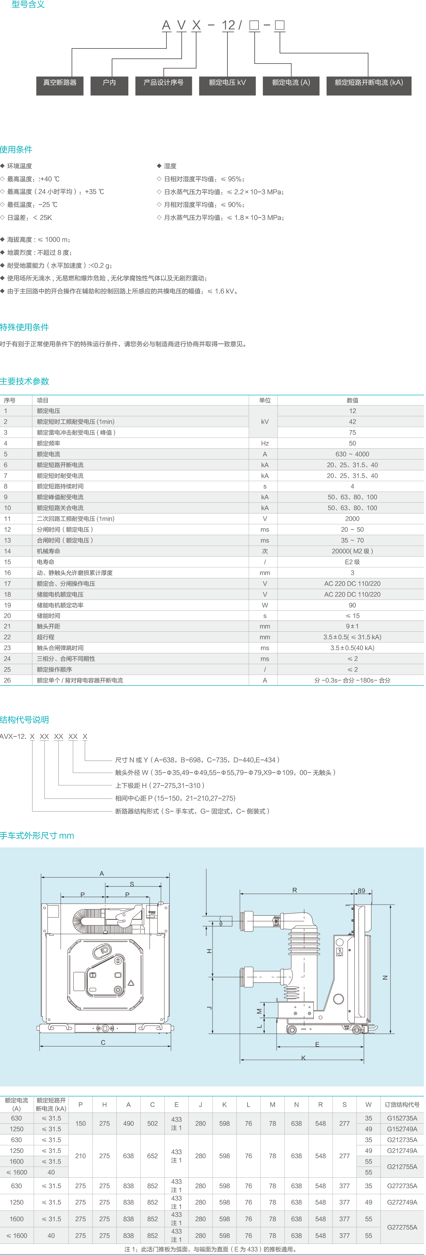 AVX-12户内高压真空断路器(以下简称断路器)是用于12 kV电力系统的户内开关设备,作为电网设备、工矿企业动力设备的保护和控制单元,在配电系统里用作控制及保护电缆、架空线、配电站、电动机、变压器、发电机和电容器等设备。断路器主要用于合分短路电流和投切各类负荷(如有载或空载下的架空线及电缆、变压器和发电机、电动机、谐波控制系统,甚至是并联电容器)。