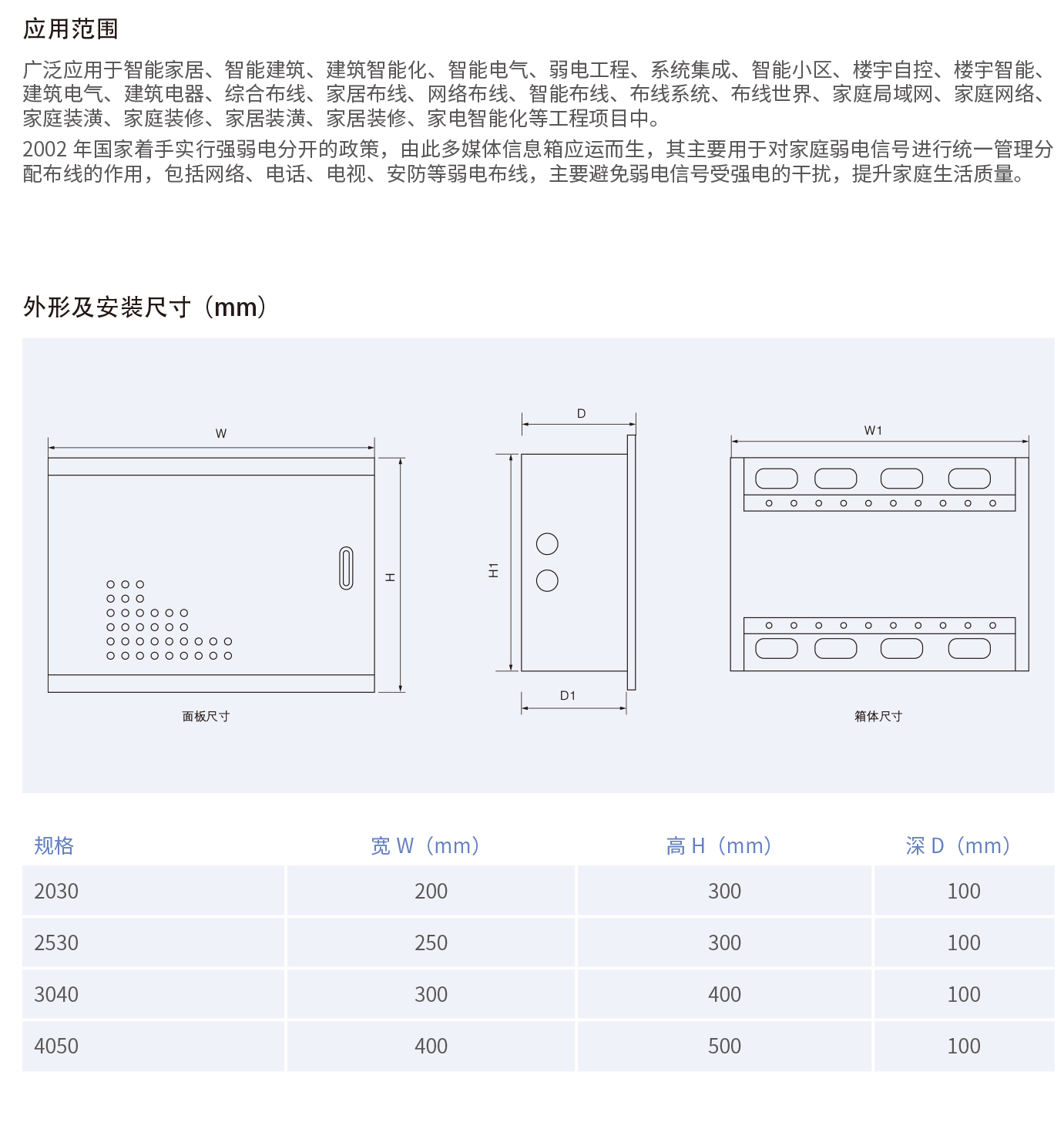 多媒体信息箱是智能家居各弱电系列在家庭中的多媒体集成信息箱,采用暗装形式、模块化结构,箱盖为工程塑料更为环保,实用性更强,外观美观大方。多媒体信息箱可安装有线电视/数据/语音接线模块、保安监控接线模块、宽带网络交换机、宽带路由器、电源等模块。